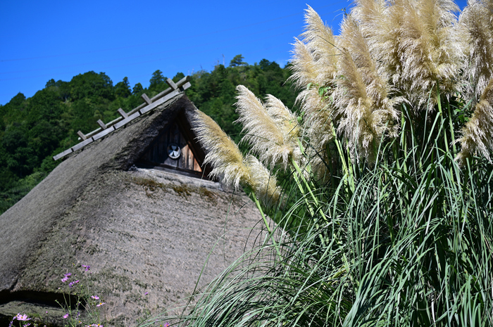 ススキに畑、そして茅葺屋根の民家