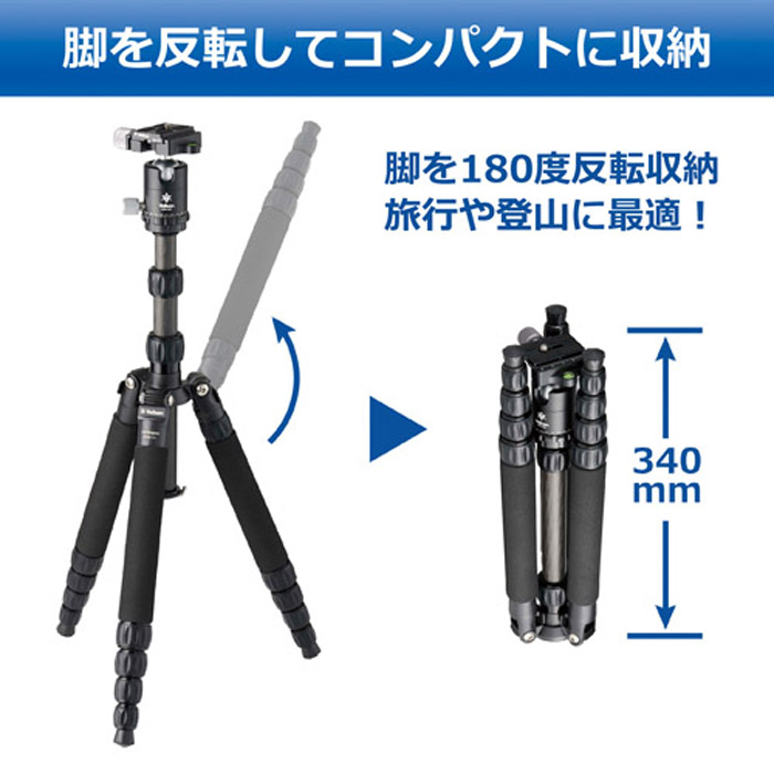 脚反転収納採用で軽量・コンパクトなトラベルカーボン三脚。登山などに最適な超小型軽量モデル。